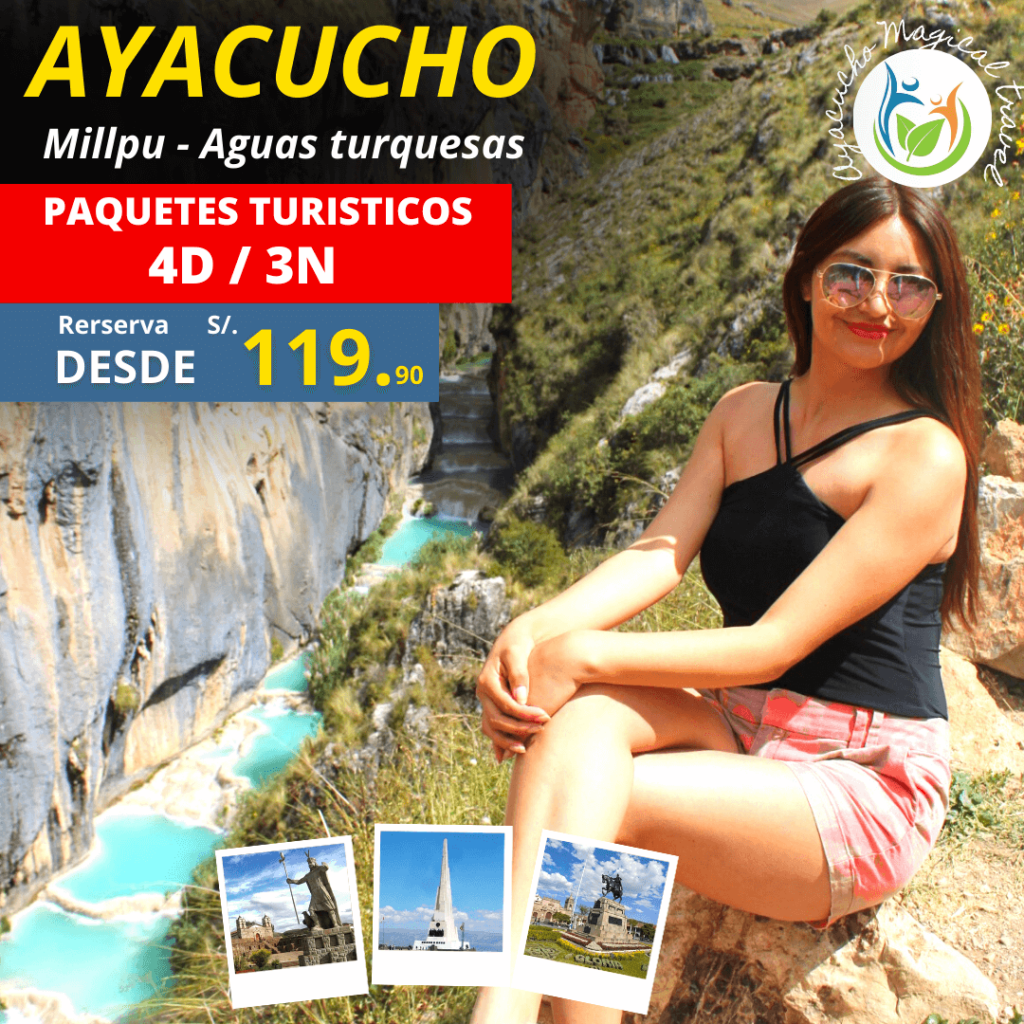 Ayacucho Emocionante de 4 Días y 3 Noches: Recorre las históricas calles de Huamanga en el City tour, Visita Las aguas turquesas de Millpu, La fantástica ruta inca de Vilcashuaman, Explora las hermosas aguas turquesas del Río Millpu y por último visita el tour Wari Quinua en el único bus panorámico de la ciudad.